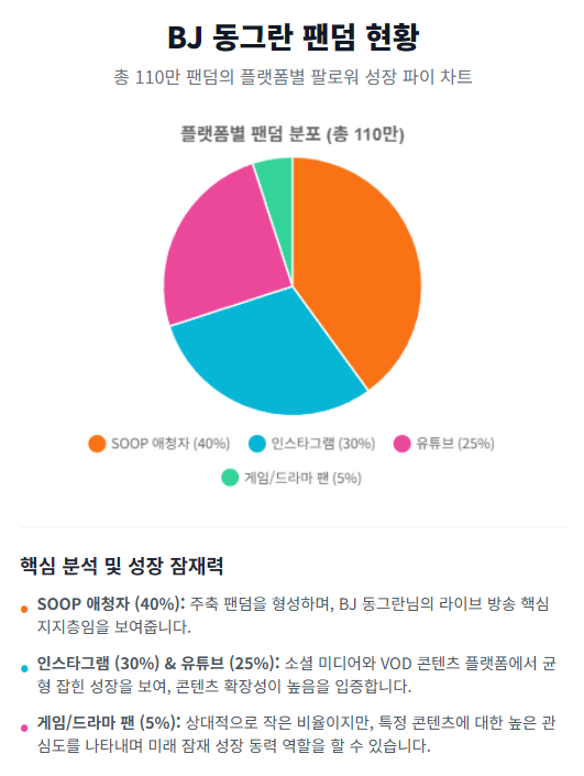 BJ 동그란의 총 110만 팬덤을 플랫폼별로 나눈 파이 차트로, SOOP 애청자가 40%로 주축을 이루며 인스타그램 30%, 유튜브 25%로 균형 잡힌 성장을 보여줍니다. 색상은 오렌지·청록·핑크·민트로 시각적으로 매력적이며, 게임·드라마 팬 5%가 미래 성장 잠재력을 암시합니다.